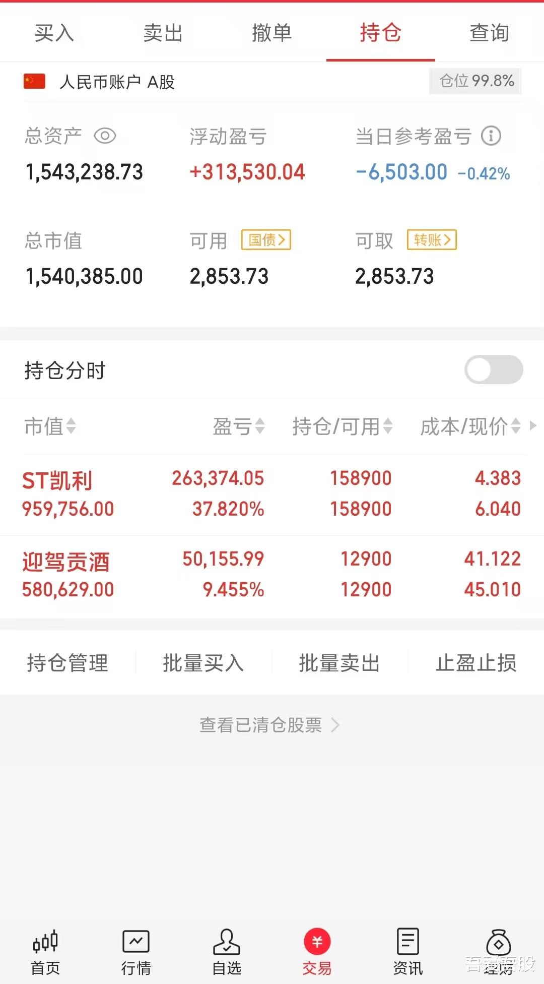 今天虽然大盘跌的比较多,但持仓的股票对抗风险的能力还是比较强,截止到收盘,重仓的凯利上涨了0.8点,轻仓的迎驾下跌了2.4个点,整体亏损幅度在0.5个百分点以内。从整体看,通过这样的仓位管理,市值波动的风险较小。