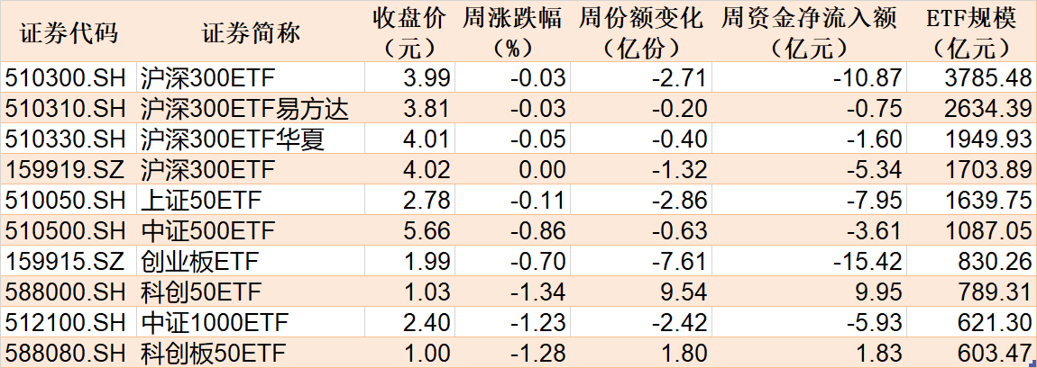 本周市场主要股指集体调整,规模较大的ETF中,科创50、中证1000等相关ETF跌超1%。