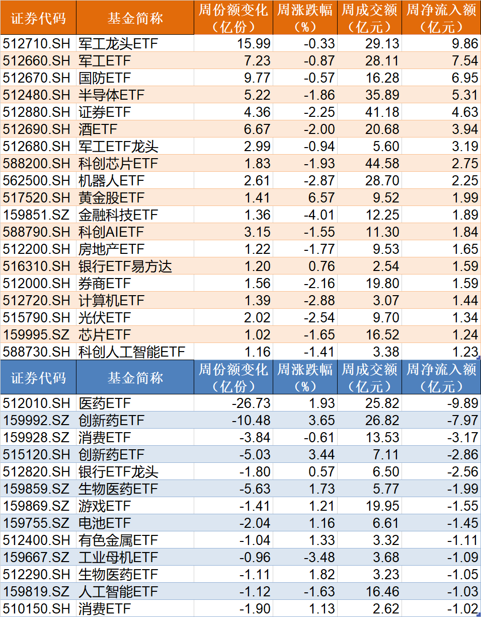 行业主题上看,军工相关ETF被资金看好,而医药相关ETF被资金抛售。